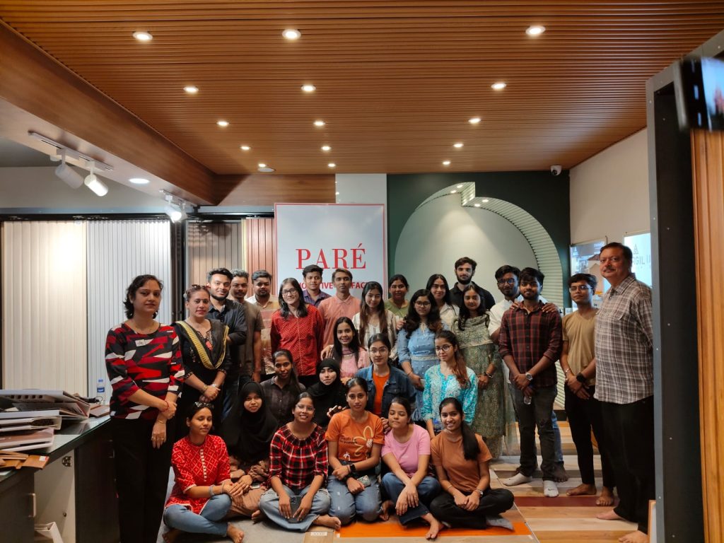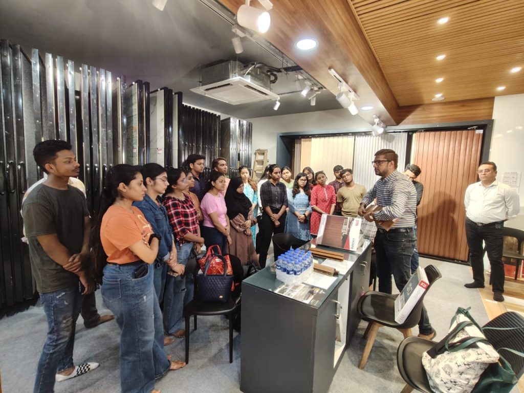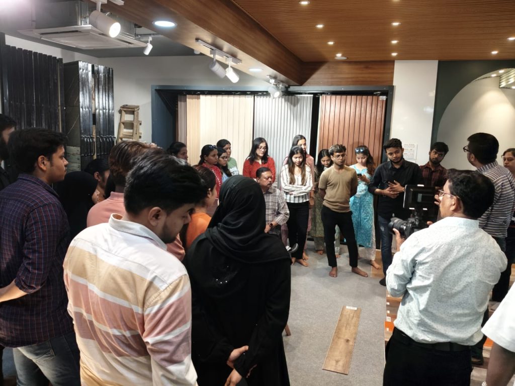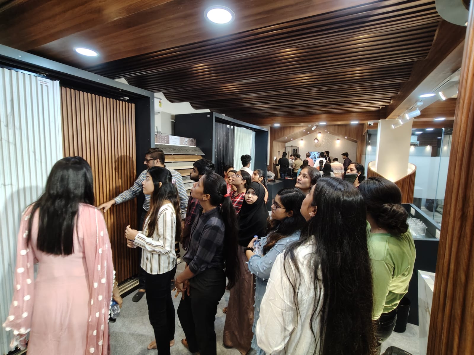 The visit to DRS Interior Solution Design Studio was organised on the 23rd April ’24. 27 students and two faculty members from ID 2Yr (2022-24) sem IV & ID 1Yr (2023-24) sem II had visited the design studio. DRS solution deals with PARE innovative surfaces and ARGIL SPC floorings. The design studio displayed the various related products, which helped the students to get a deeper understanding of the product specifications, application and pricing.