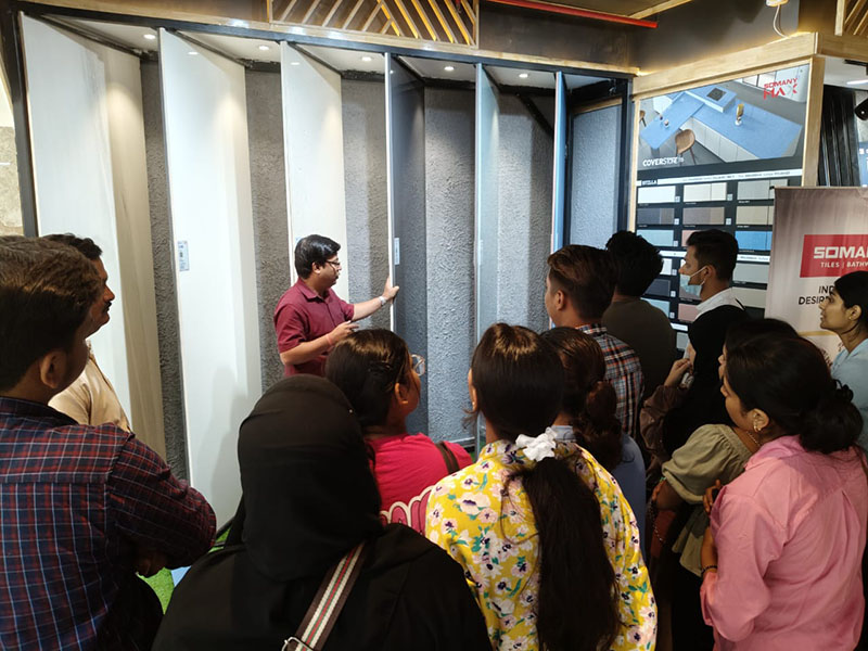 At Somany Tiles display center students were briefed about the tiles manufacturing process, tiles installation products and the various installation techniques.